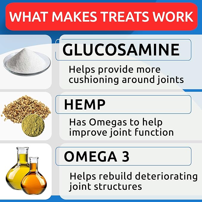 - Potent Formula: Our chews are loaded with active ingredients like glucosamine chondroitin for dogs and MSM to improve mobility and reduce joint inflammation. Plus, hemp for dogs for powerful pain relief.