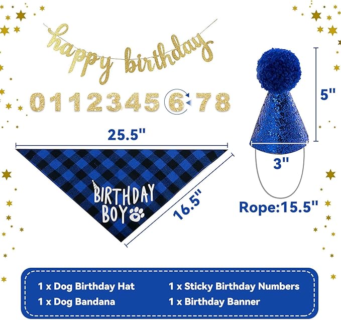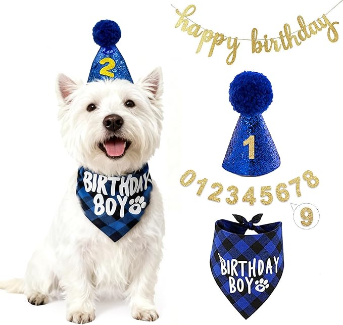 About This Dog birthday gift set: Dog hat with number*1, dog bandana*1, birthday banner with string*1. Give your dog a... Read more