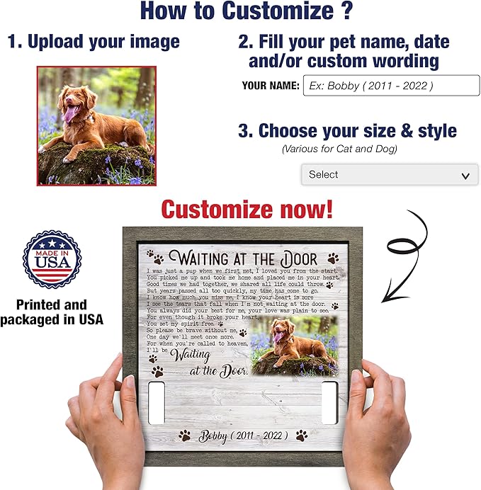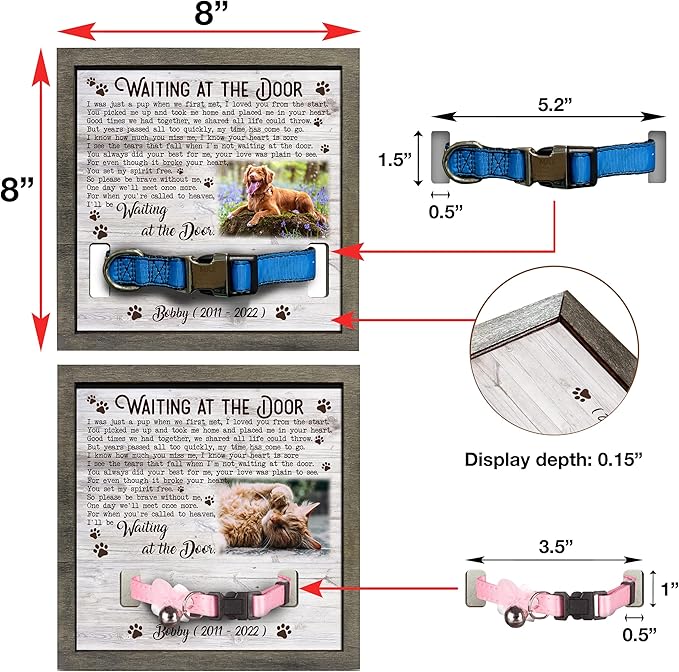 - ITEM DIMENSIONS: Our customized pet loss sign comes in two sizes, 8x8" and 8.7x10.6," and serves a variety of purposes. Additionally, you may use a personalized pet memorial frame as a table decoration or as a part of your home decor by placing it on a shelf, mantle, table, or wall. It will be a lovely pet memorial piece.