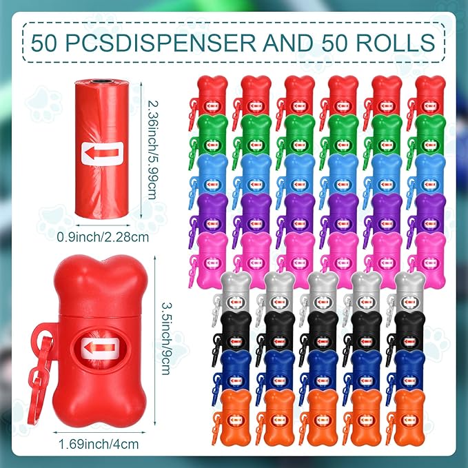 - What You Will Get: packed with 50 pet waste bag dispensers in 10 different colors, including red, green, orange, blue, black, pink, yellow, grey, black& yellow and grey& red; Each dispenser comes with a roll of garbage bags for you to use at any time; Sufficient quantity and variety of colors allow you to share with family and friends