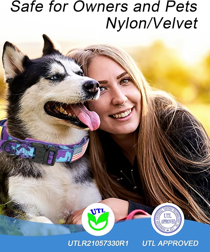 Hotsky Tactical Dog Collar, Adjustable Military Training Nylon Airtag Collar with Handle and Heavy Duty Metal Buckle for Medium Large Dogs, with Airtag Holder and Two Patches(Purple Camo,M)