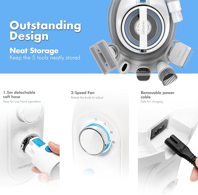- 5 Essential Grooming Tools: Includes a grooming brush, deshedding tool, electric clipper, nozzle tool, and cleaning brush—keeping your pet’s coat healthy and your home fur-free.