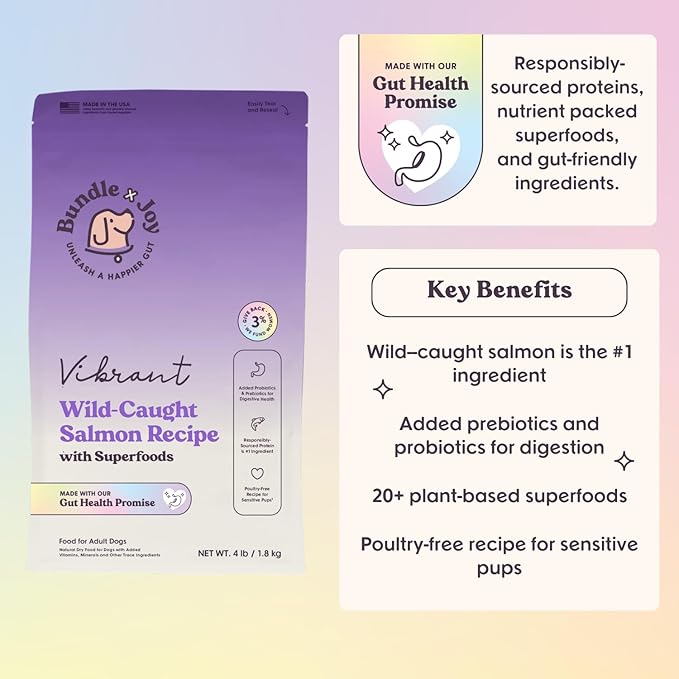 Vibrant Probiotic Dog Food Dry, Salmon, 18lb Bag, Allergy and Gut-Friendly Adult Kibble for Digestive Health with Wild-Caught Salmon, 20 Plant Based Superfoods, Grain x Poultry Free