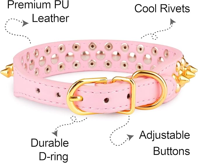 Epesiri Golden Spike Collar for Dogs, Gold Spiked Dog Collar, Durable PU Leather Studded Dog Collar with Leash, Funny Mushrooms Rivet Small Puppy Pet Cat Adjustable Collar, Pink XS