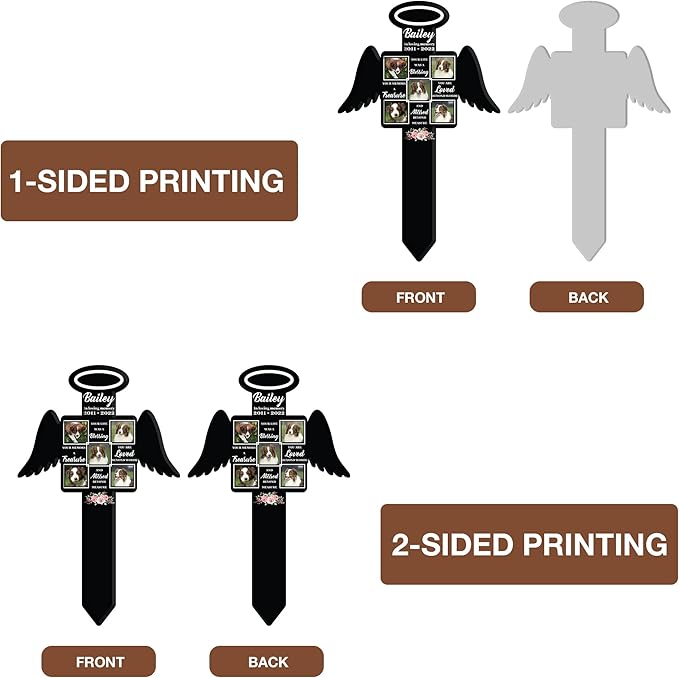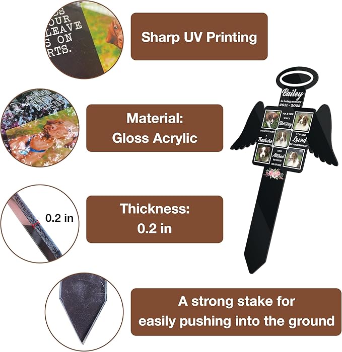 - PRINTING: All of our custom dog outdoor grave marker crosses are processed with outstanding UV printing technology, sharp and durable printed color, 1 side printing, and high-quality products. You will receive the pet plaque stake for the garden or yard in a timely manner.