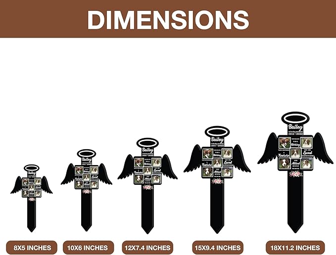 - ITEM DIMENSIONS: Our pet grave markers personalized animal cross comes in three sizes 3 sizes 8″ x 5″ & 10″ x 6″ and 13″ x 7.5″ and serves a variety of purposes. An acrylic stake is included. We recommend digging a hole first, then installing your memorial and backfilling it. This will prevent any damage or breakage to your memorial stake.