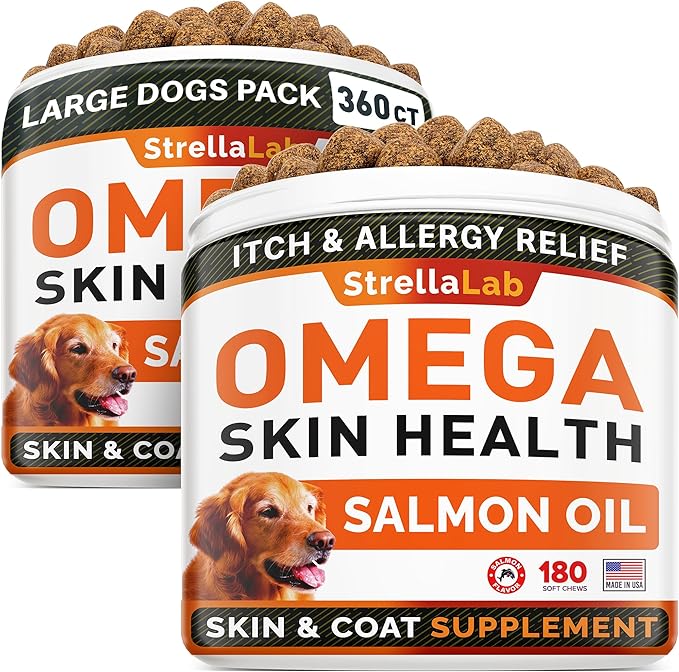 StrellaLab Omega 3 for Dogs - (360Ct) Fish Oil Treats - Allergy & Itch Relief Skin & Coat Supplement - Dry Itchy Skin, Anti Shedding & Hot Spots Treatment - Pet Salmon Oil Chews - Salmon Flavor