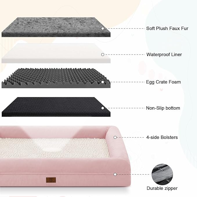 Large Orthopedic Dog Bed, Waterproof Dog Bed with Removable Cover, 4-Sides Removable Bolster Soft Pet Sofa with Egg Crate Foam Non-Slip Bottom, Pink