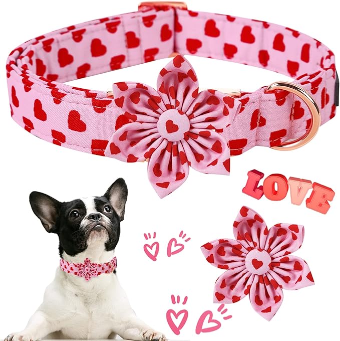 ARING PET Valentine's Day Dog Collar-Adorable Pink Heart Dog Collar with Flower, Adjustable Cotton Girl Dog Collars with Metal Buckle