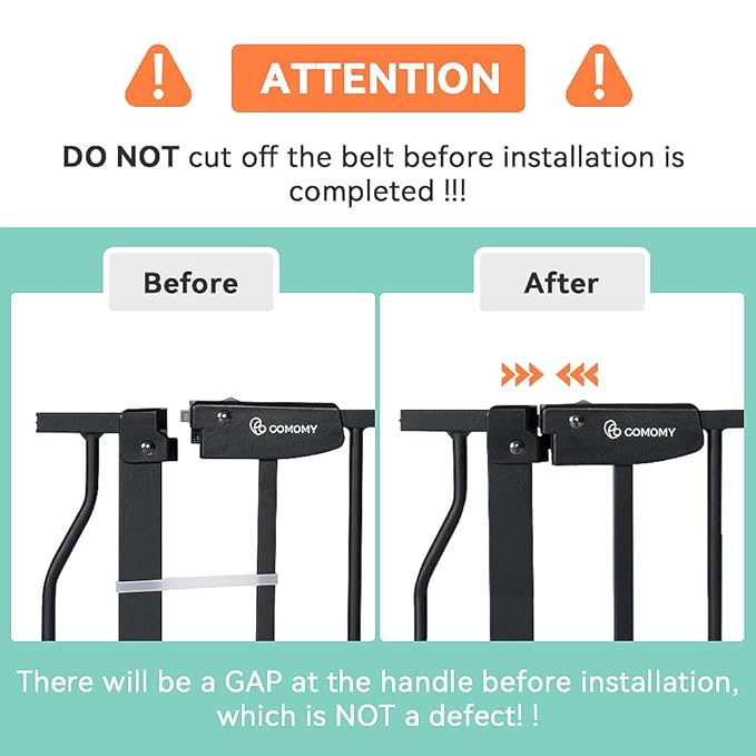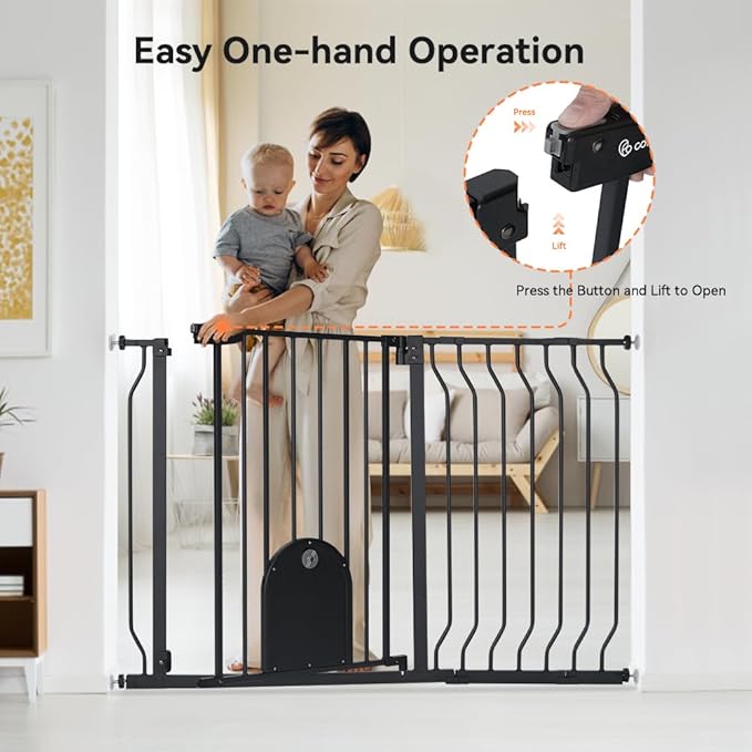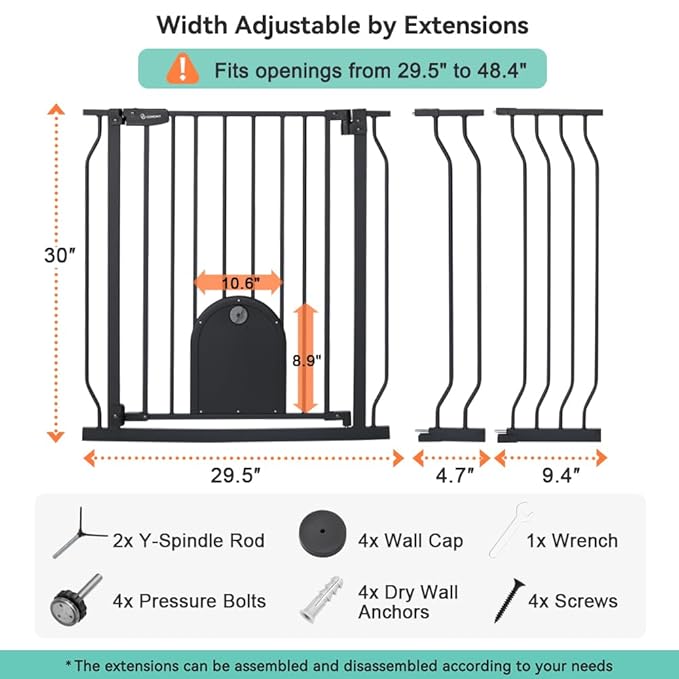 COMOMY 29.5-48.4" Baby Gate with Adjustable Cat Door,Extra Wide Metal Cat Gate for Stairs Doorways, Auto Close Dog Gate with Pet Door for House, Pressure Mounted Easy Walk Through (30" Tall, Black)
