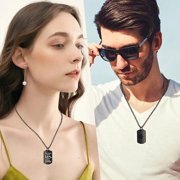 - ASHES JEWELRY FOR PET: This dog tag urn necklace is perfect for honoring a beloved pet who has passed away, preserving their memory and carrying it around with you every day.