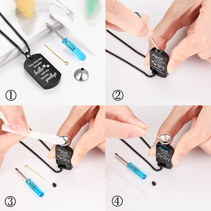 - SIZE AND DETAILS: Tag pendant size: 1.28 inches in length and 0.71 inches in width, Adjustable chain length: 20 inches with 2 inches extension chain. This pet ashes necklace will come with a nice velvet pouch for you to store the urn pendant and a set of filling tools to better help you fill the pendant.