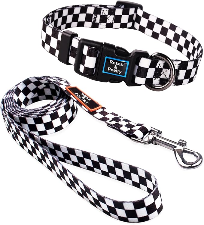 Roses&Poetry Dog Collar and Leash for Medium Large,Adjustable Durable 5ft Puppy Leash Collar for Dog Training Lead(Black & White-M)