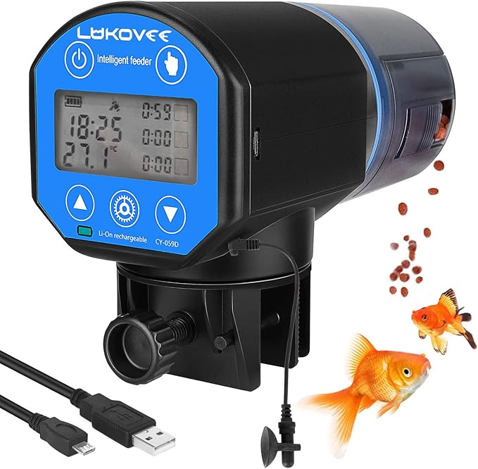 Lukovee Automatic Fish Feeder, Feeding Time Display USB Rechargeable Timer Moisture-Proof Aquarium or Fish Tank Food Dispenser with 200ML Large Capacity with Temperature Measure Function, Blue