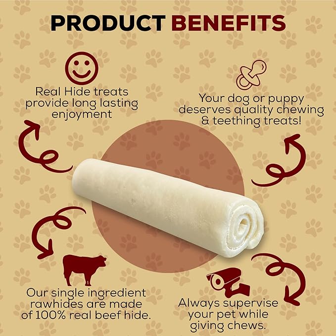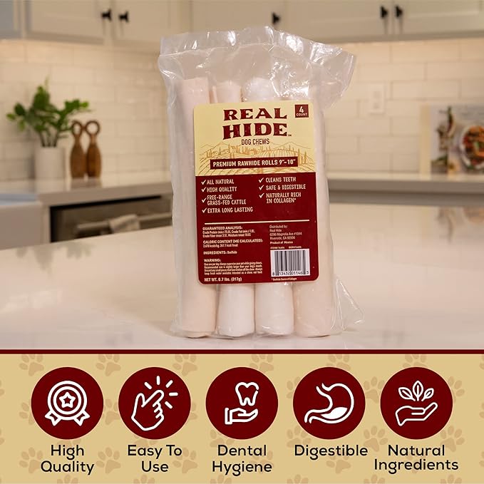 | All Natural Dog Chew Treats - Premium Rawhide Rolls, 9-10 Inch - Long Lasting Grass Fed Free Range Beef Hide - Medium/Large Dogs - 4 Count