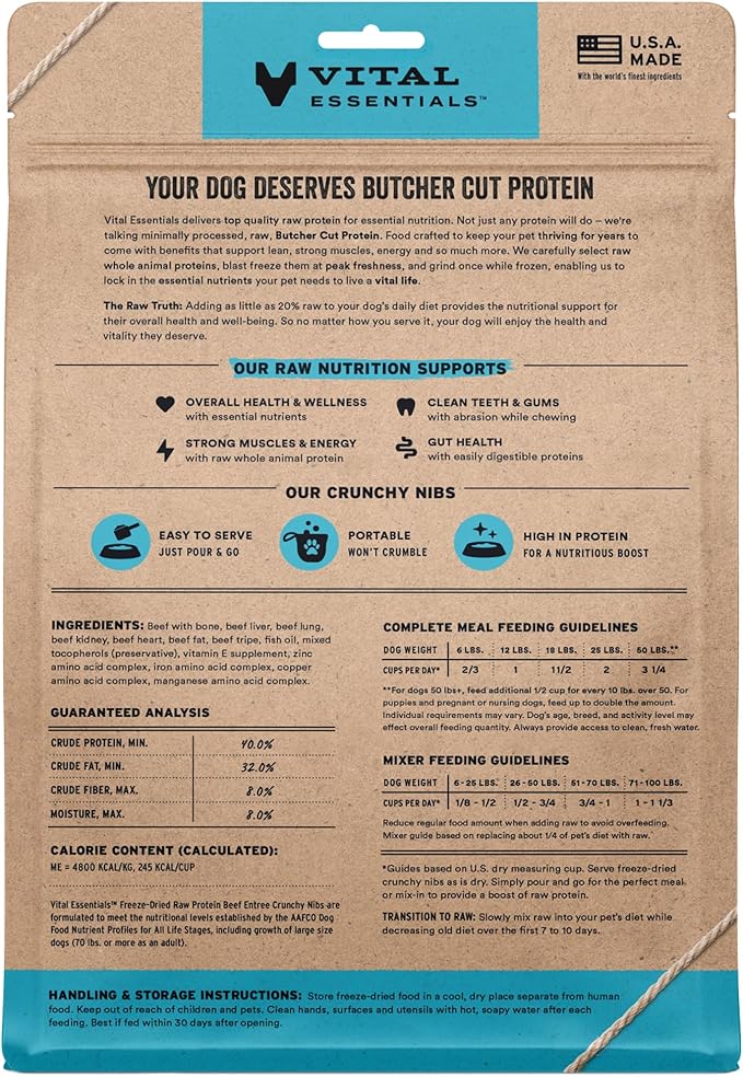 - CRUNCHY FREEZE-DRIED RAW BEEF DOG FOOD: Vital Essentials Crunchy Freeze Dried Dog Food packs more protein than industry standard into every bite to deliver the peak vitality your dog deserves, especially when compared to dehydrated dog food. This complete and balanced freeze-dried raw dog food is made with premium butcher cut beef, responsibly sourced in the USA.