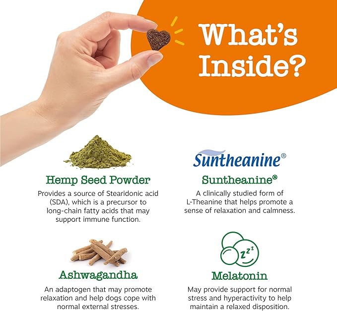 - Featuring Suntheanine - Every dog calming chews contains Suntheanine, a clinically studied and super premium form of L-Theanine that helps promote a sense of relaxation and calmness for your pup.