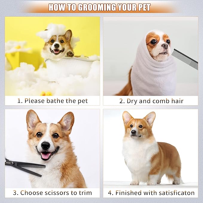 - ✔【Round Tipped Ends Design More Safety】Safety round tip that keep pets safe, never need to worry about poking your pet's skin, especially in sensitive areas such as the eyes and ears. whether professional pet groomer, hairdresser or novice, you can easily and safely use this pet scissors to trim body hair or face hair for your dogs, cats and other pets. You can become a professional beautician at home, saving time and money, never worry about accidental injury.