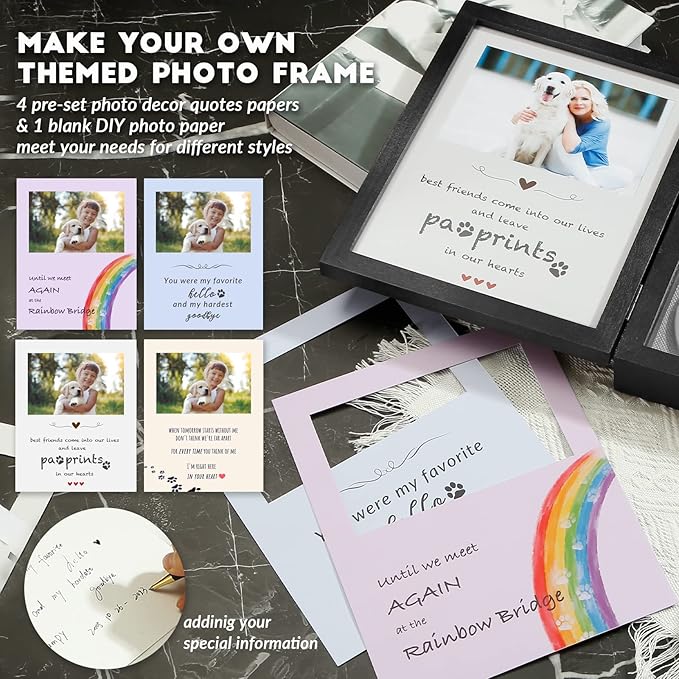 - Meaningful Personalization - Craft a truly personalized memorial with the included accessories. The 4 printed photo cards feature trendy memorial quotes that evoke emotions and capture the essence of your pet's spirit. Each card has space to insert a 6" photo, allowing you to cherish their special moments forever. Additionally, the blank card provides the opportunity to add your own heartfelt message, creating a truly unique and personal tribute to your beloved pet.