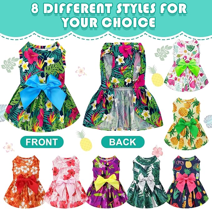 LEIFIDE 8 Pcs Summer Themed Hawaii Dog Dresses Holiday Flamingo Fruit Floral Pattern Pet Skirts Hawaii Puppy Princess Dresses Outfits Bowknot for Girl Dogs Cats Beach(Large)