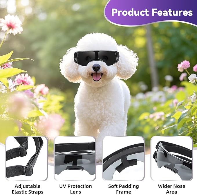 LESYPET Dog Goggles for Small Medium Dogs, UV Protection Dog Sunglasses with Foam Padded, Windproof Eye Protection Puppy Sunglasses for Riding Driving, Adjustable, Black