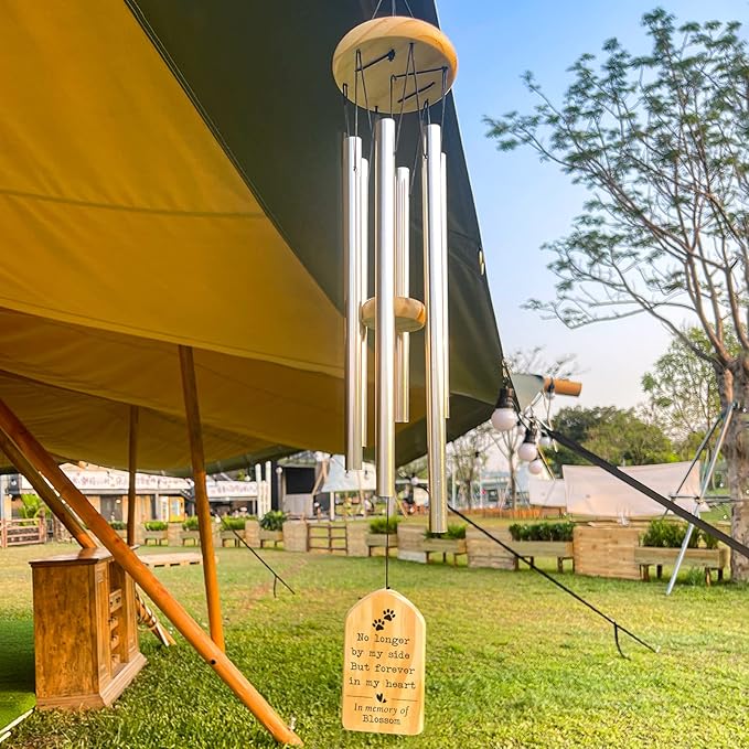 - 🐾Made of wood premium and 6 anodized aluminum tubes making them naturally weather-resistant for year-round enjoyment. Each pet memorial wind chime is hand-tuned to ensure a lovely balanced scale which is soothing to the ear.