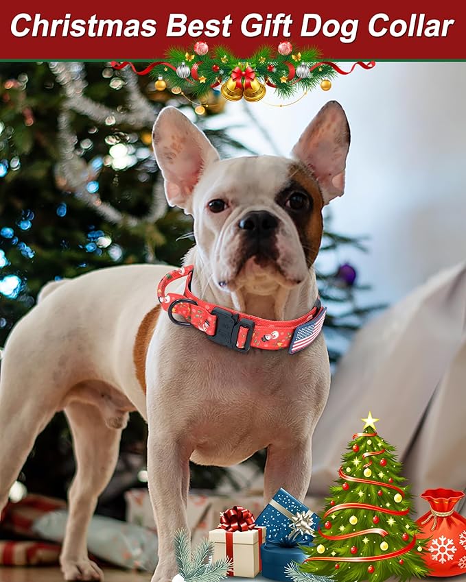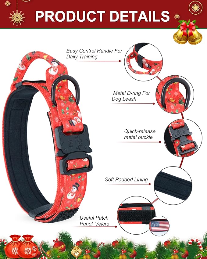 Hotsky Christmas Tactical Dog Collar, Adjustable Military Training Xmas Collar with Handle and Have Duty Metal Buckle for Medium Large Dogs, with Airtag Holder and 2 Patches(Christmas Red,M)
