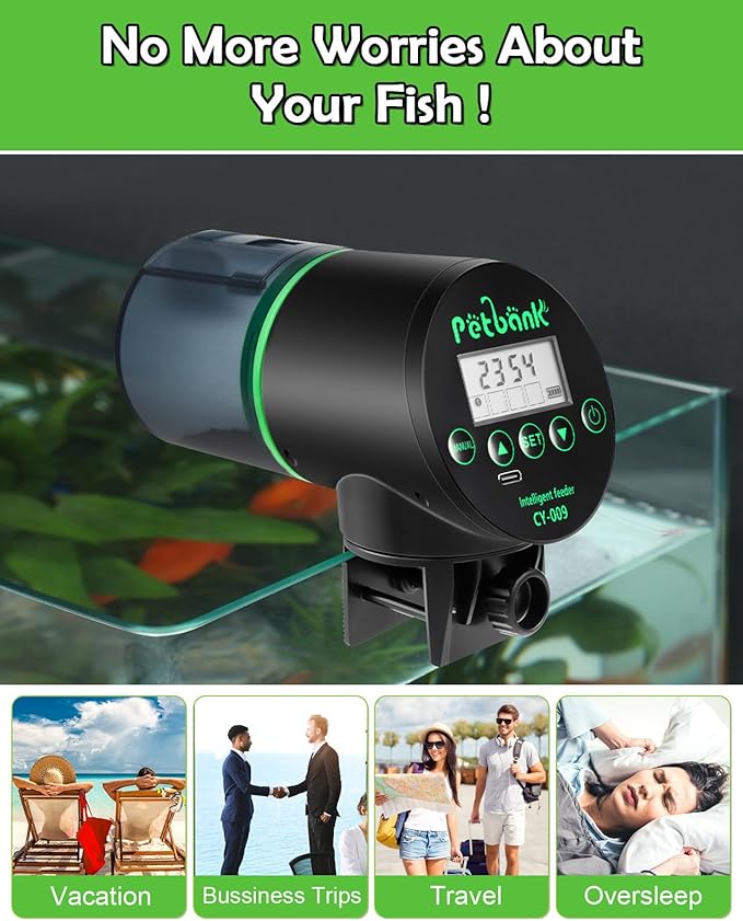 Automatic Fish Feeder for Aquarium - Rechargeable Fish Food Auto Dispenser Vacation Turtle Feeder with USB Charger Cable,LCD Screen, Customized Schedule,Black