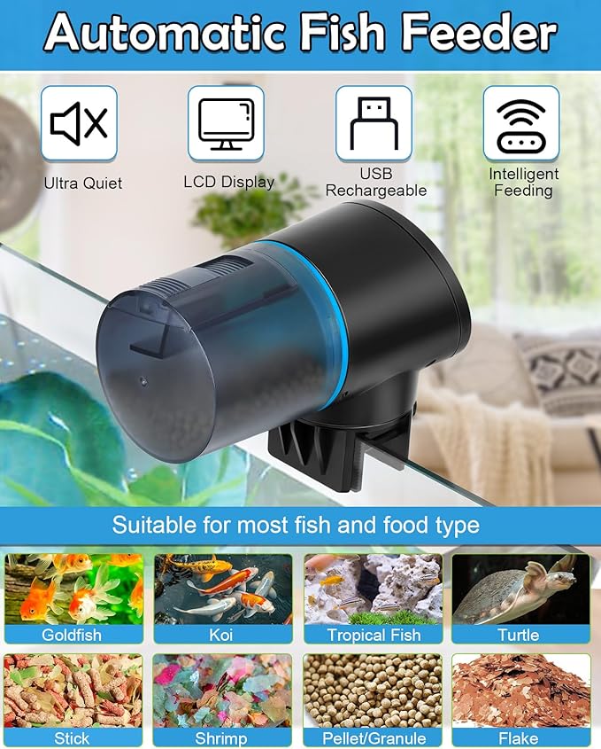 About This Convenient: Equipped with a USB charging cable, this automatic fish feeder is suitable for various charging scenarios. No... Read more