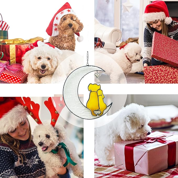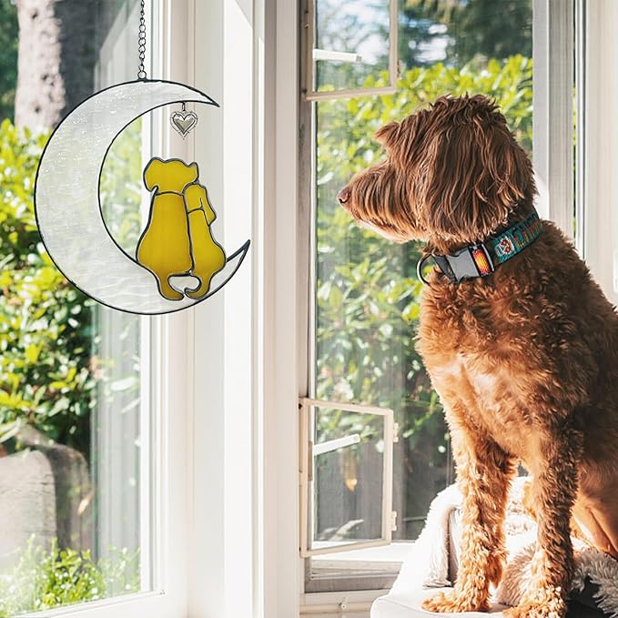 - Dog Bereavement Gifts - Each dog-on-moon stained glass piece comes with durable metal chains for easy hanging. This adorable stained glass window hanging adds a touch of charm to your space, making life more vibrant and meaningful.