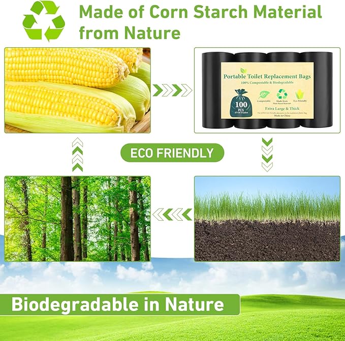 - 【Biodegradable and Eco-Friendly】Our portable toilet bags are eco-conscious, crafted from biodegradable corn starch material.In just 60-180 days, they completely decompose, minimizing their environmental impact.Ideal for outdoor enthusiasts, these camping toilet bags are designed specifically for camping toilets, travel potties, portable toilets, and buckets. Choose convenience without compromising the environment.