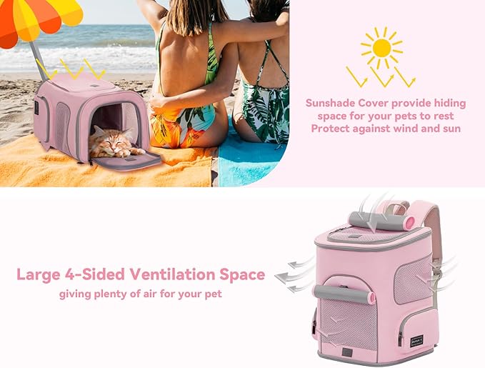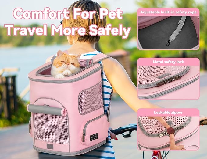 PETSFIT Pet Carrier Backpack with Upgraded Waist Protection, Cat Carrier Backpack Designed for Small Dogs/Cats, Fully Ventilated Collapsible Dog Backpack for Outdoor Traveling Hiking Camping, Pink