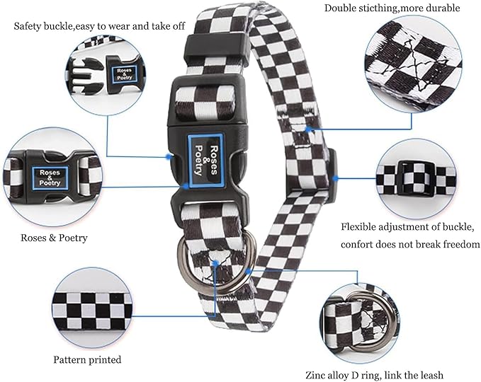 Roses&Poetry Dog Collar with Colourful Checkered Patterns, Adjustable Durable Puppy Collars for Small Medium Large Dogs (Black & White-M)
