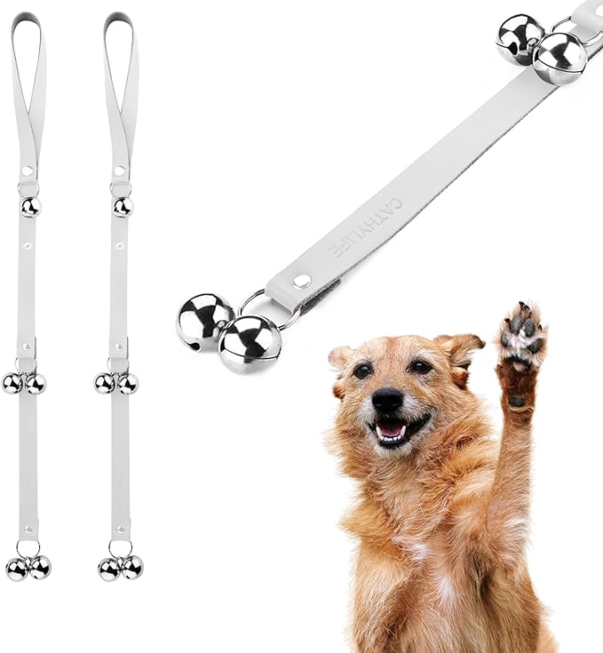 Leather Dog Doorbells for Door Knob/Potty Training/Go Outside, Length Adjustment Copper Dog Bell, Housetraining Hanging Bell, White Leather Silver Bells - 2 Pack