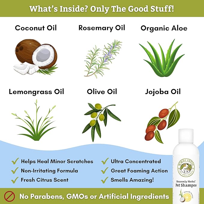 - Safe & Gentle for All Pets: Wholistic Heavenly Herbal natural dog shampoo for dry, sensitive skin contains a powerful blend of certified organic essential oils and extracts with amazing moisturizing properties; it's made with no harmful chemicals, petroleum, animal by-products, sodium laurel sulfate or animal testing