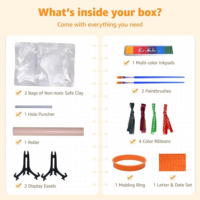 - 【Deluxe Tools Set】LOOBANI christmas ornament kits with all handmade accessories , Includes 2 packs of 50g white clay, multi-color inkpads, 2 paintbrushes, roller, circular mold, hole puncher, 4 ribbons, 2 bonus display stands, step by step instructions,and a silicone letter mold to print the birthday and name of your fur companion.