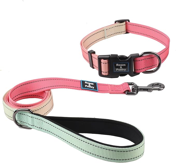 Roses&Poetry Pink Dog Collar and Leash Set for Medium Dogs, Adjustable, Reflective, Durable, 6 Feet