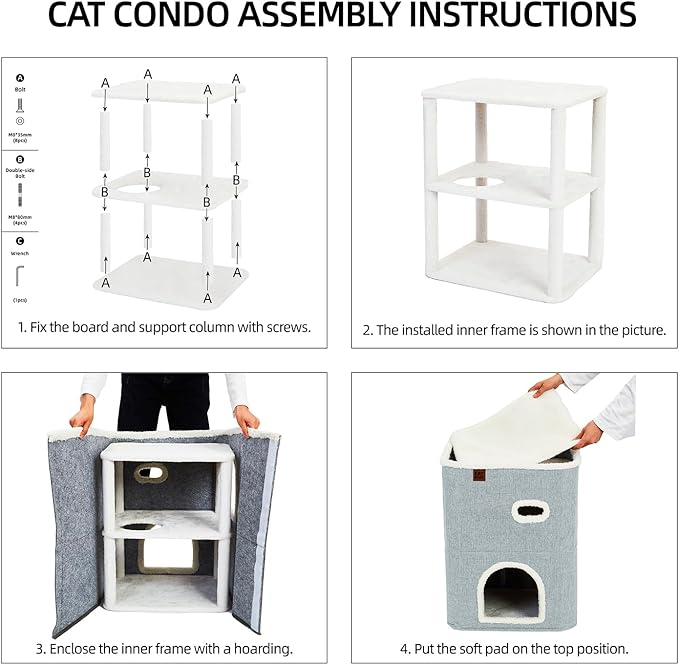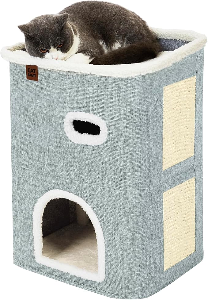 CATBOAT 2-Storey Cat House for Indoor Cats Bed, Covered Beds & Furniture with Scratch Pad and Hideaway Cave, Cute Modern Condo for Multi Small Pet Large Kitten Kitty, Light Grey