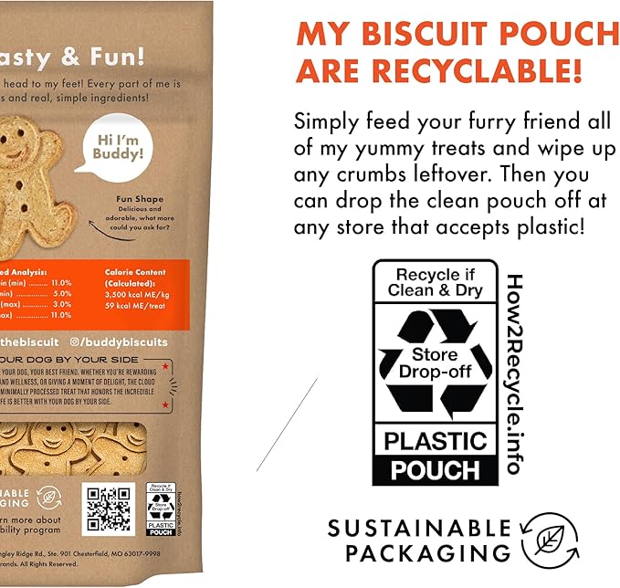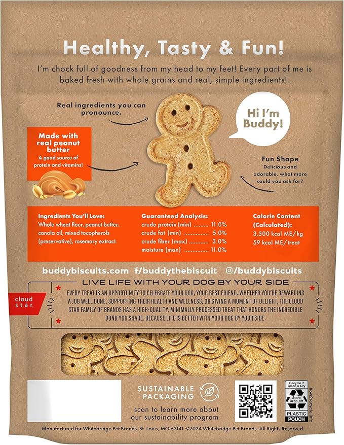 About This BUDDY BISCUITS: Contains ONE 2 lb value size bag of whole grain Buddy Biscuits. These adorable, crunchy biscuits... Read more