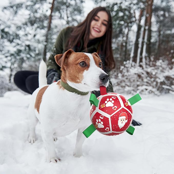 QDAN Small Christmas Dog Toys, Soccer Ball with Straps, Outdoor Interactive Toys for Tug of War, Puppy Birthday Gifts, Water Toy, Durable Dog Balls for Puppy (5 Inch)