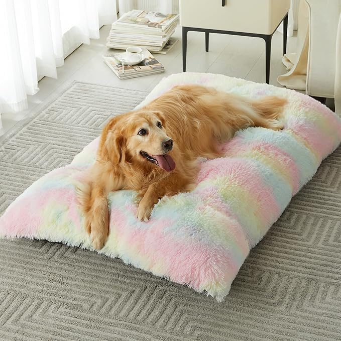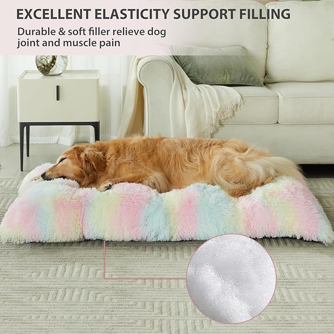 BFPETHOME Dog Beds for Large Dogs, Plush Dog Crate Bed Fluffy Cozy Kennel Pad for Sleeping &Ease Anxiety, Washable Pet Mats with Anti-Slip Bottom for Large Dogs, Rainbow