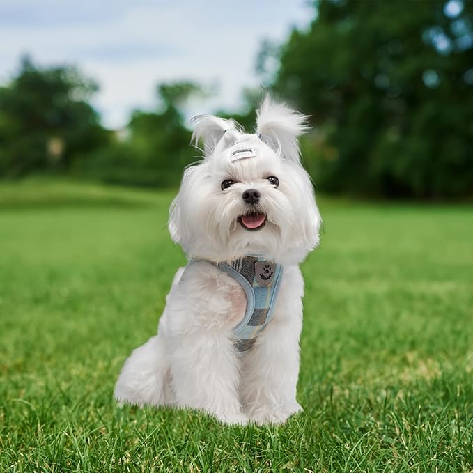 EXPAWLORER Classic Plaid Puppy Harness - Small Dog Collar and Leash with AirTag Holder Case - Soft Mesh Padded Adjustable Dog Vest Harness No Pull, Reflective Escape Proof for Outdoor, Blue XS
