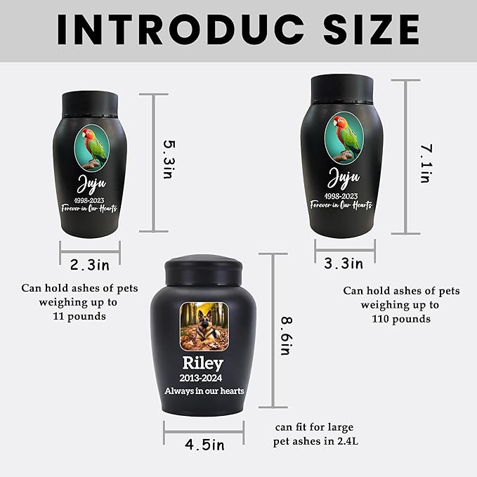 - Suitable for All Pets: Our urns for dogs come in two sizes for your choice. The large size is 3.35*7.1 inches, and the small size is 2.36*5.3 inches. Suitable for all sizes of dogs and other pets, so you can find the perfect size for your beloved pet.