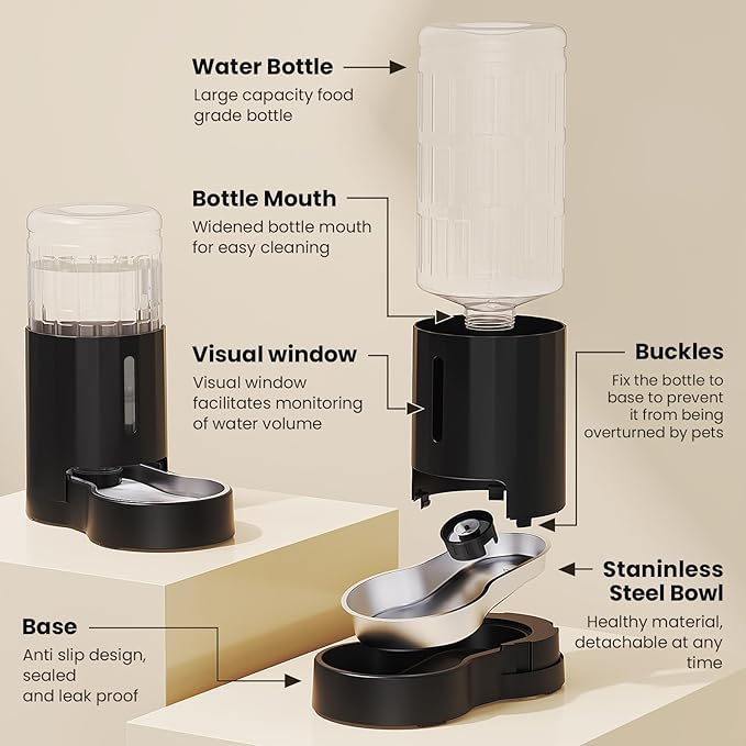 CZPET Dog Water Bowl Dispenser, 8L Automatic Dog and Cat Water Dispenser with Stainless Steel Bowl, Gravity Waterer, Large Capacity, and Quiet Drinking Area for Pets (8L,Black)