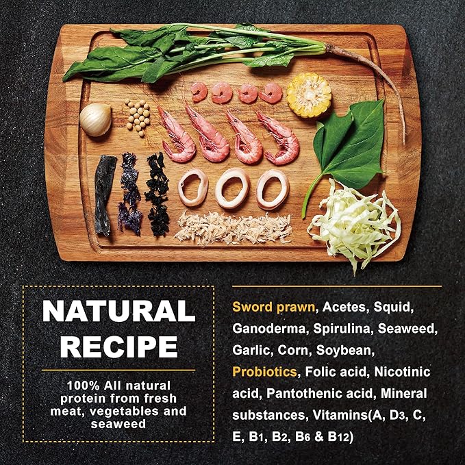 About This High Palatability : Up to 40% fresh sword prawns + acetes, squids, vegetables and seaweed. A perfect 9:1... Read more