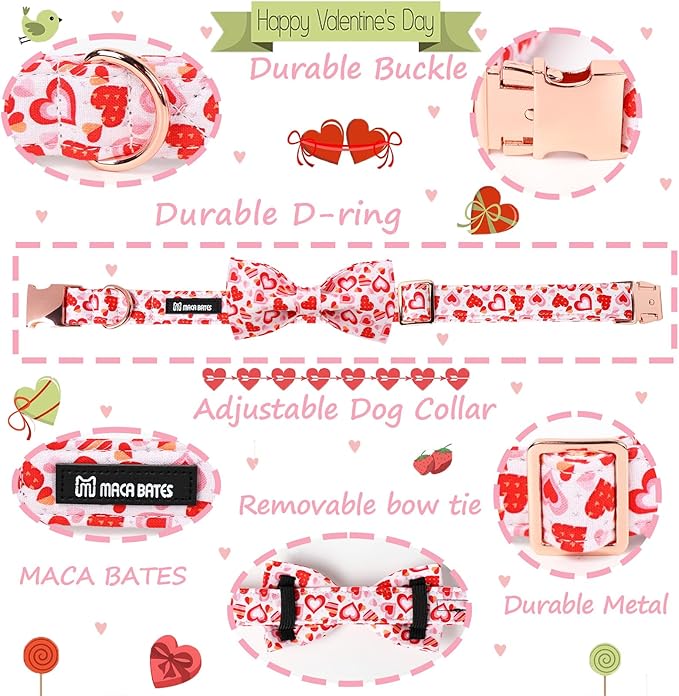 Maca Bates Valentine's Day Dog Collar with Fancy Bow for Large Girl Boy Dogs,Love Pink Hearts Pattern,Adjustable Durable Soft Valentine Gift for Female Male Puppy