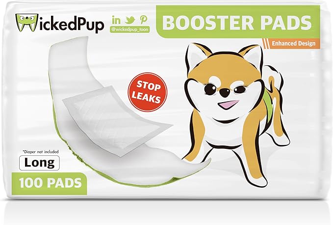WICKEDPUP Dog Diaper Liners Booster Pads for Male and Female Dogs, 100ct | Disposable Diaper Inserts fit Most Reusable Pet Belly Bands, Wraps, and Washable Period Panties (Long (100 Count))
