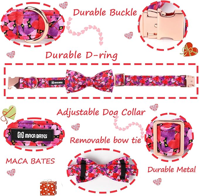 Maca Bates Valentine's Day Dog Collar with Fancy Bow for Large Girl Boy Dogs,Tiedyed Love Hearts Pattern,Adjustable Durable Soft Valentine Gift for Female Male Puppy