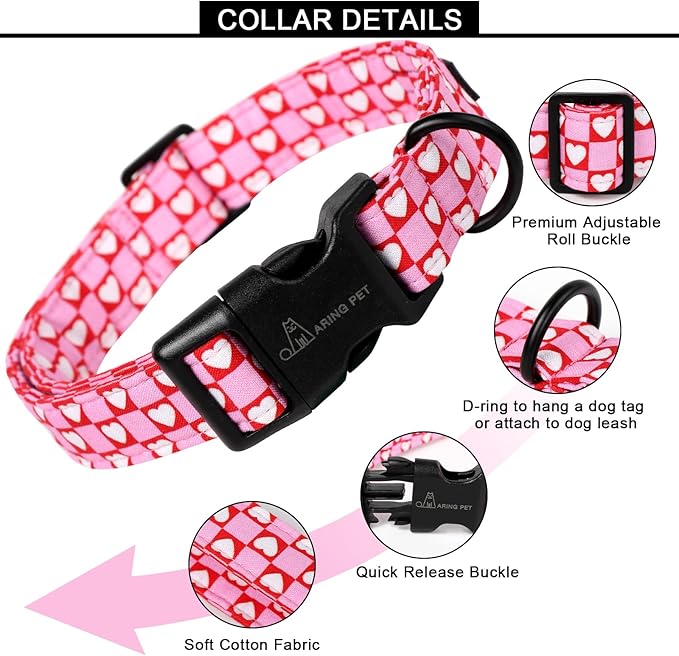 ARING PET Valentine's Day Dog Collar, Cute Pink Red White Heart Pet Collars with Quick Release Buckle for Puppy Small Medium Large Boy Girl Dogs-L