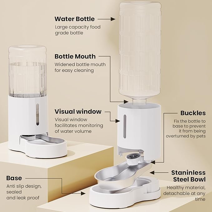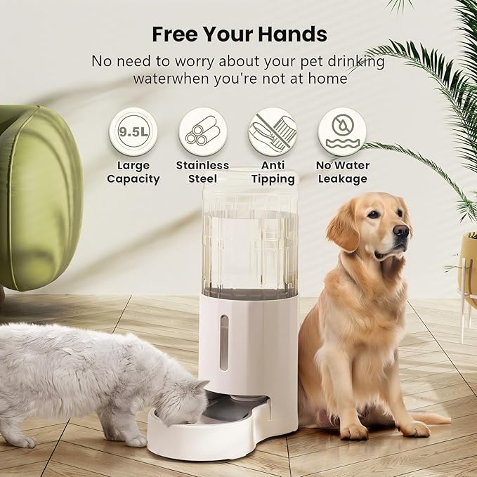 CZPET 2.5 Gallon Dog Water Bowl Dispenser, Automatic Dog and Cat Water Dispenser with Stainless Steel Bowl, Gravity Waterer, Large Capacity, and Quiet Drinking Area for Pets (9.5L,White)
